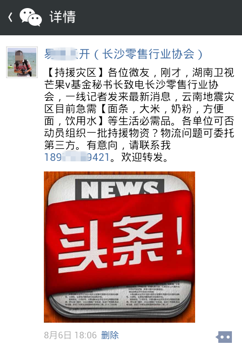 据了解,8月6日晚,长沙零售行业协会从湖南广播电视台芒果V基金得知云南鲁甸灾区亟需面条等必需物资的消息后,立即通过网络、微信等平台发起倡议,号召筹集一批赈灾物资。