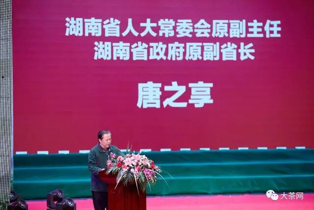 湖南省人大常委会原副主任、湖南省政府原副省长唐之享发表讲话,湖南省粮油茶等农产品产量居全国前列,茶产业发展势头良好。全民品茶周联动全球200多个城市联动。希望桃源县借助首届世界茶节的优势推广壮大桃源茶,让桃源茶走向全国,走向世界。